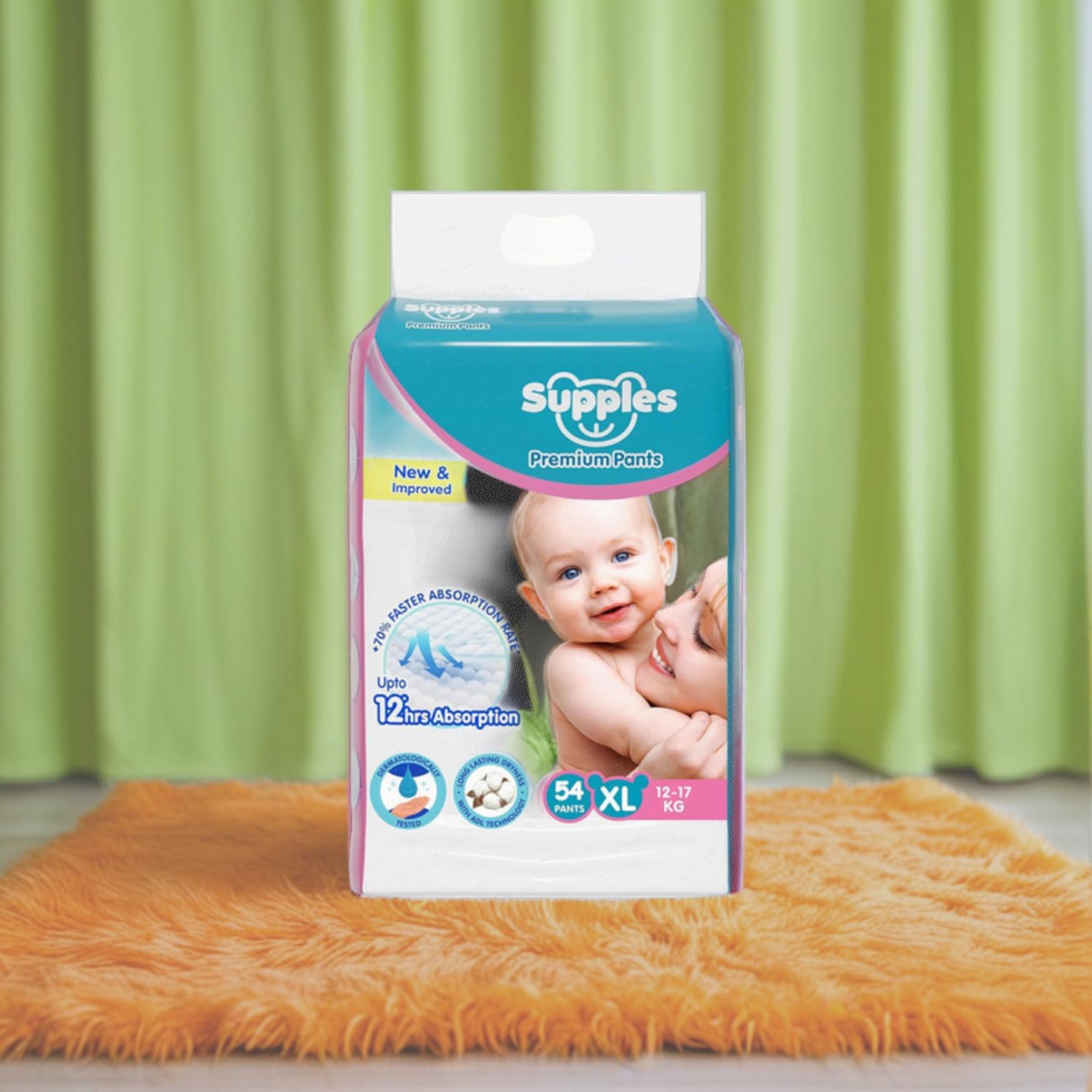 Amazon Brand – Supples Premium Baby Diaper Pants | 54 Baby Diapers | XL | 12-17 Kg | 12 Hrs Absorption | Cushiony Cotton Soft Fabric | Phthalates-Free | Triple Leak Guard