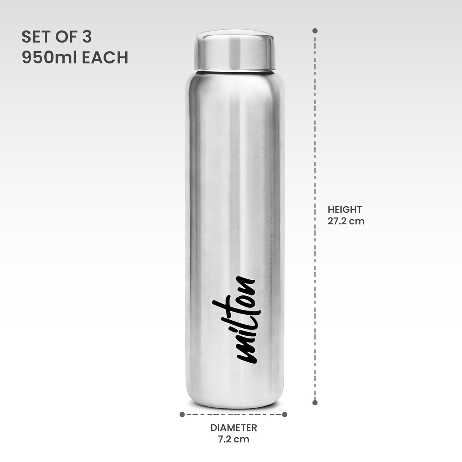 MILTON Aqua 1000 Stainless Steel Water Bottle 920 ml, Set of 3, Single Walled, ISI Certified I Leak Proof Lid, Rust Proof I For School, Office, Gym I Silver