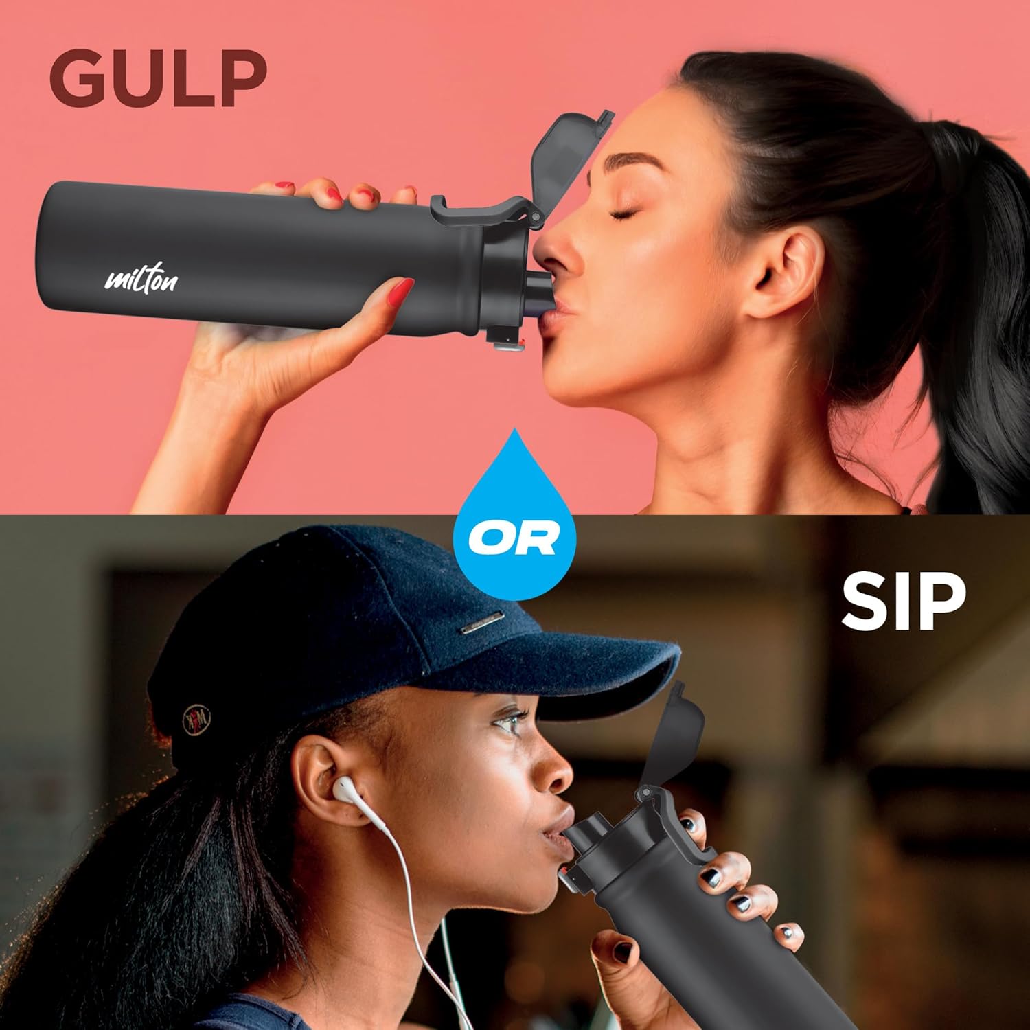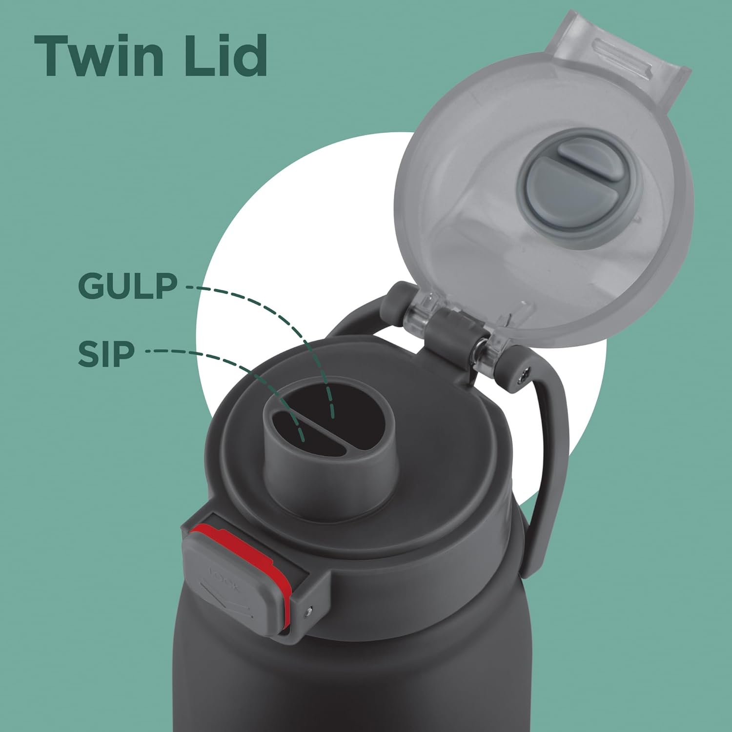 TWIN LID DESIGN – SIP OR GULP: Smart 2-in-1 Lid water bottle offers 2 ways to drink – gulp during workouts or sip while traveling. Slide down to lock, slide up to open – perfect for on the go.